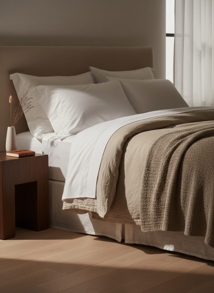 Think about bedding. The most luxurious beds aren’t the ones with the highest thread count; they are the ones with layers. A percale sheet (crisp), a linen duvet (wrinkled, soft), a chunky wool throw (heavy). Even if they are all the exact same shade of “Sage Green,” the bed looks expensive because the light hits the linen differently than it hits the wool.