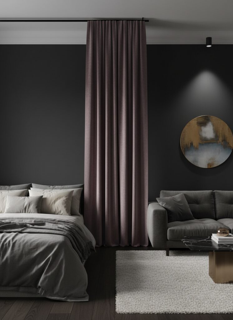 In a moody aesthetic, you can do this with color blocking (using rugs) or physical barriers. A velvet curtain on a tension rod is a dramatic, theatrical way to hide a bed. It adds softness, absorbs sound, and screams “luxury hotel” rather than “dorm room.”