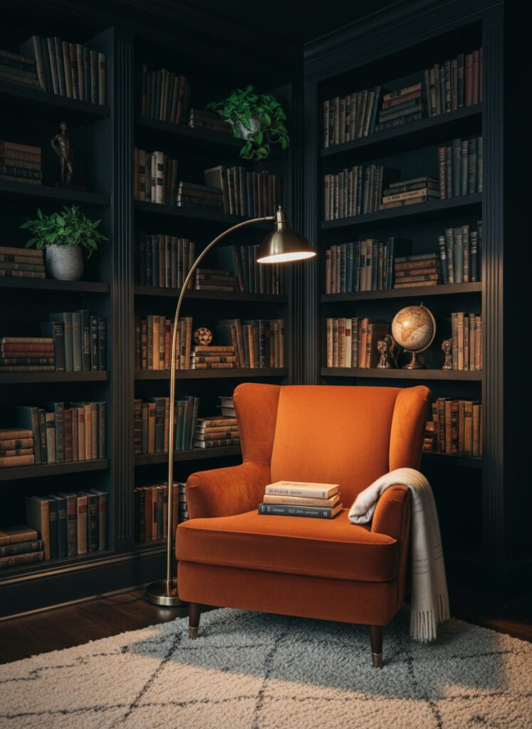 Use the space above the door frame. Use the space above the kitchen cabinets. In a moody room, books act as insulation. Walls of books feel cozy; piles of books on the floor feel messy. There is a difference.