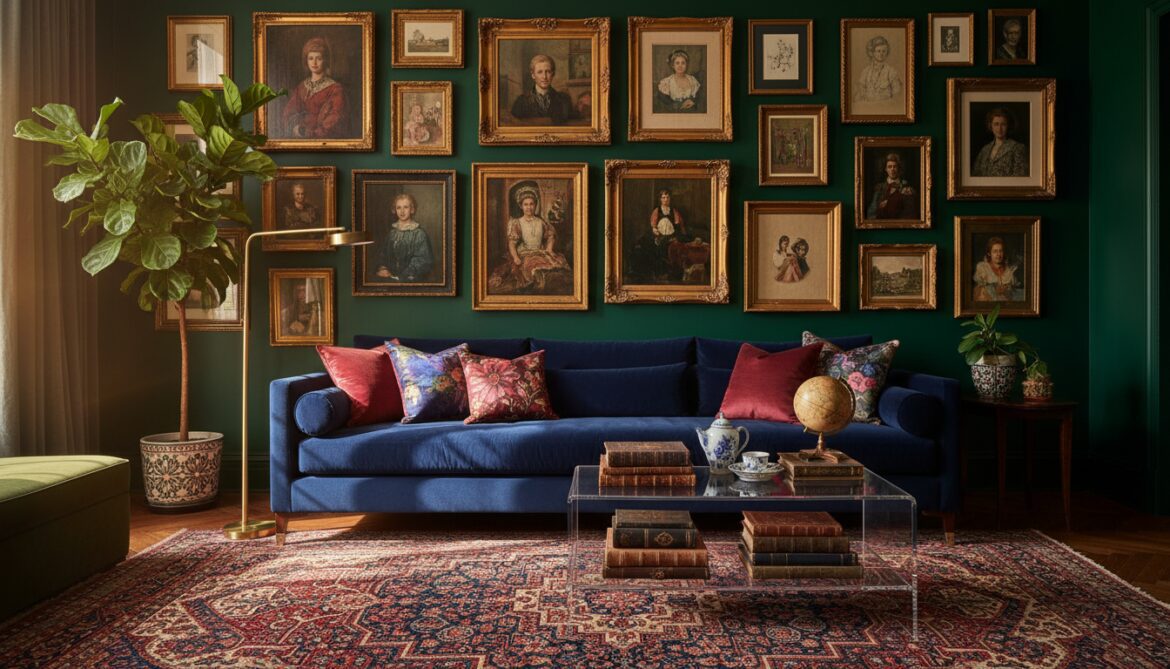 Moody Maximalism is about density. It creates an atmosphere so thick you have to wade through it. For renters and small homeowners, this is the escape hatch from the “temporary” feeling of white walls. It says, “I live here, I have a personality, and I am not afraid of dust.”