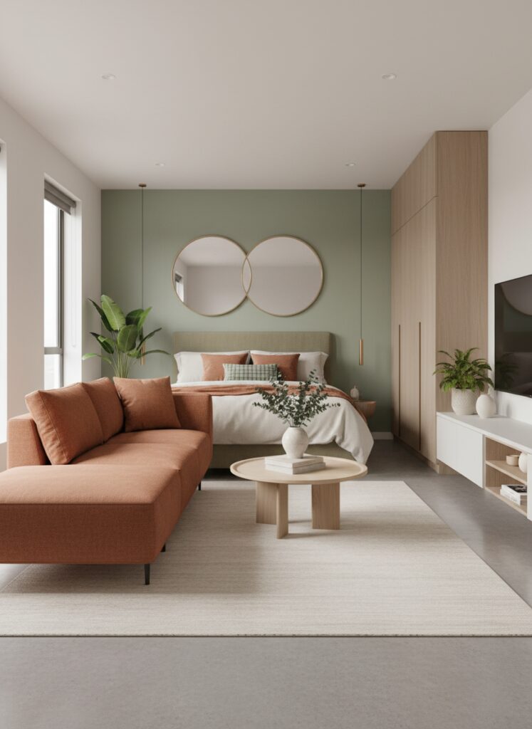 In fact, dark terracotta is one of the best tools for studio apartment micro-zoning.