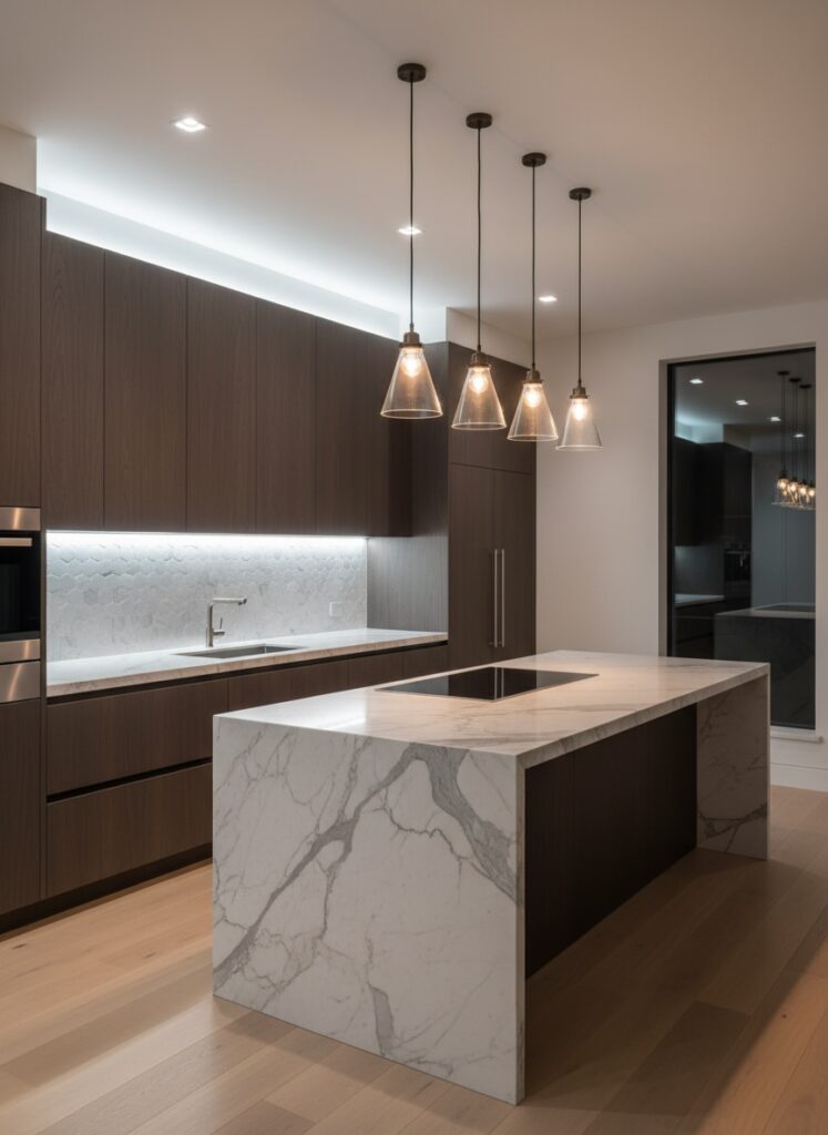 The kitchen is the hardest room to light because it has a split personality. It is a workspace, but it is also a gathering space.